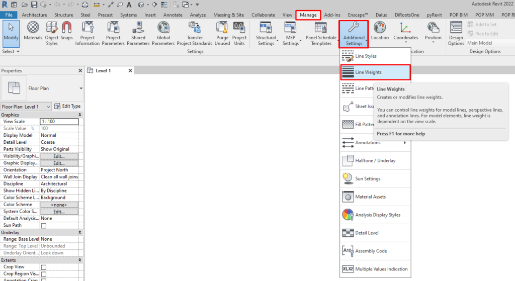To access line weight setup window in Revit, we need to go to Manage tab > Setting panel > Additional Setting drop down > Line Weight button.